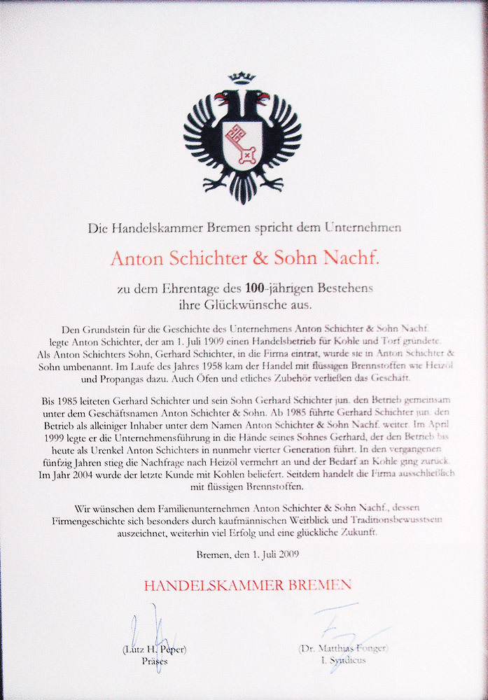 Als mein Großvater Gerhard Schichter (geb. 23.12.1909, gest. 01.03.1988) in die Firma eintrat, wurde sie in Anton Schichter & Sohn umbenannt. 1958 kam der Handel mit flüssigen Brennstoffen (Heizöl und Propangas) hinzu, auch einige Öfen und Zubehör verließen unser Geschäft.